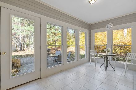 With vaulted ceilings, skylights, and a fireplace, the living room provides a warm place to gather or relax. Set off down the hall from the living room are the bedrooms, including the primary bedroom with a private bathroom. A three-season porch leading to a patio allows for the enjoyment of the landscaped yard.